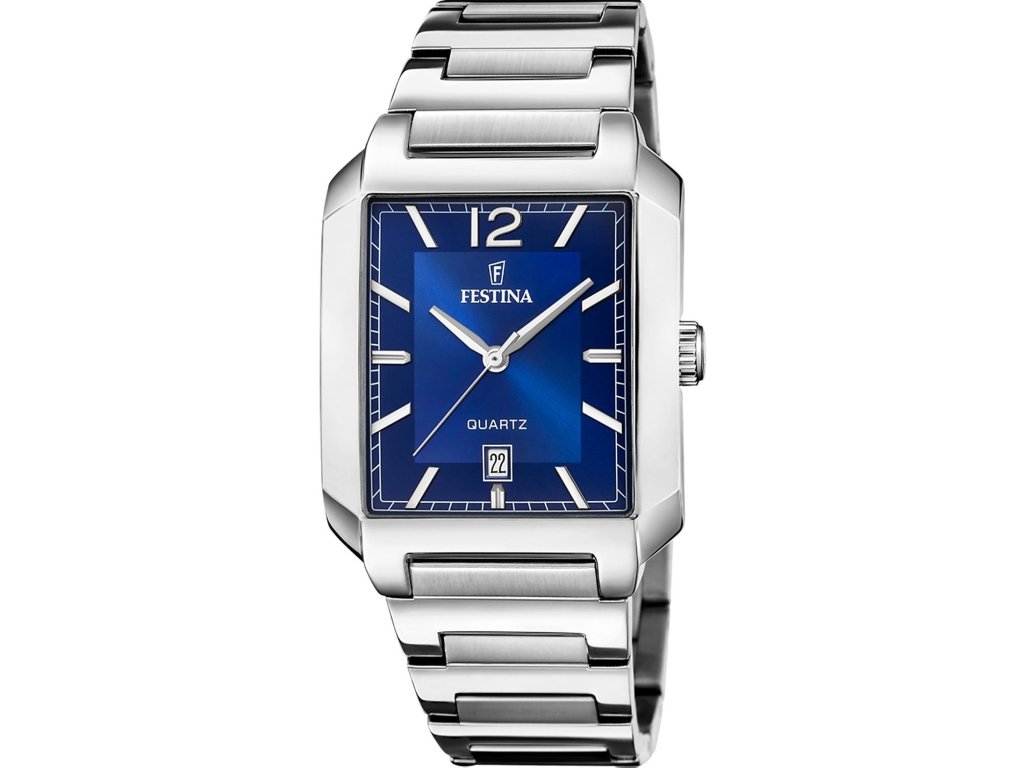 Pánské bateriové hodinky v klasickém stylu na ocelovém náramku s ocelovým hranatým pouzdrem širokým 40,5 milimetru. Modrý číselník s efektem slunečního brusu a ukazatelem data je chráněn minerálním sklem. S vodotěsností 50 metrů